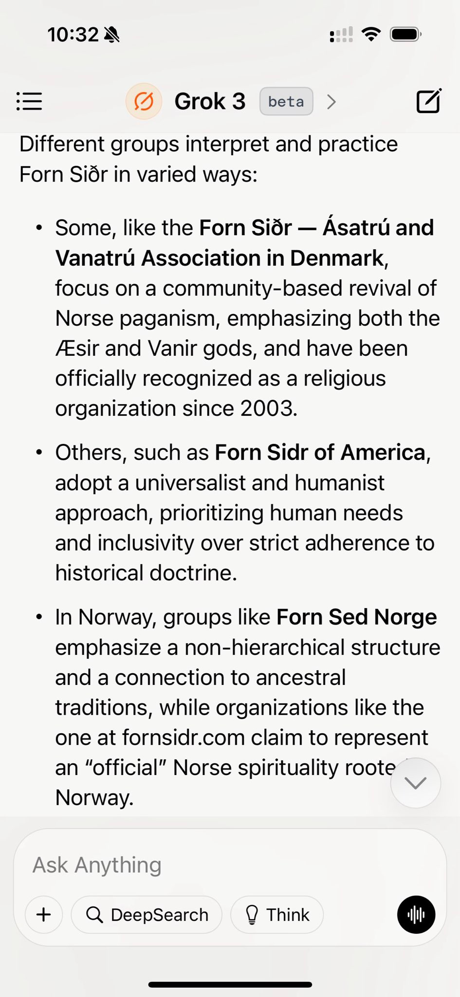 Instead, Grok refers to the far left leaning Forn Sidr in Denmark, followed by the radical left Forn Sidr of America, against which we won the lawsuit, which is not even allowed to use the term “Forn Sidr” anymore as courts have determined we own in, which has been inactive for close to 2 1/2 years (latest post was from Sep 21, 2022), and which ultimately appears defunct. Next is an obscure inactive association in Norway of a completely different name (Forn Sed), followed by name of our web site, not even in bold characters, and associated with a gratuitous, passive aggressive, derogatory comment.