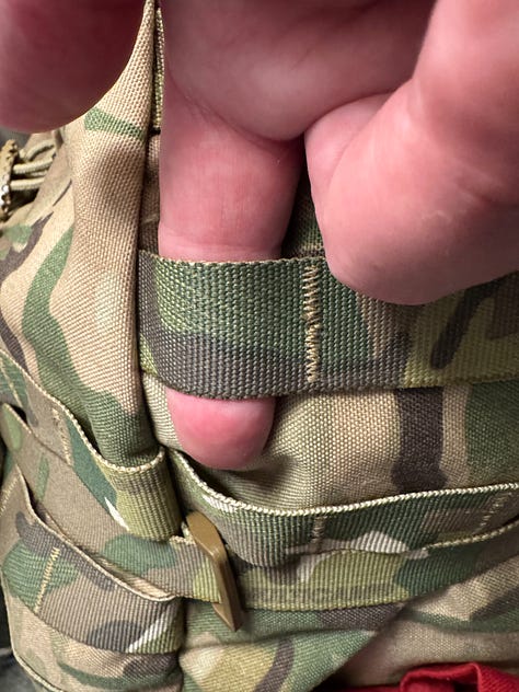 Mystery Ranch also increased stitching allowance to 1/4 of an inch, meaning that the webbing has become irregular, making it a challenge to attach and detach pouches, especially with cold fingers with diminished dexterity.