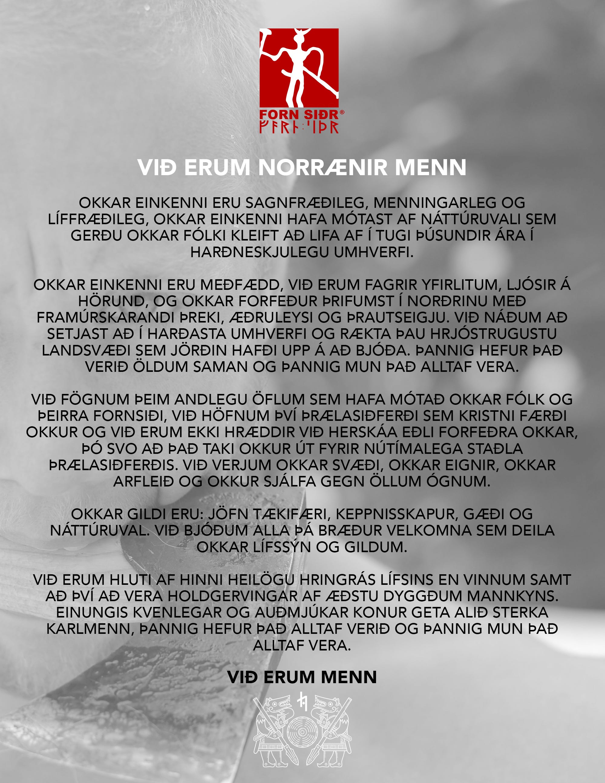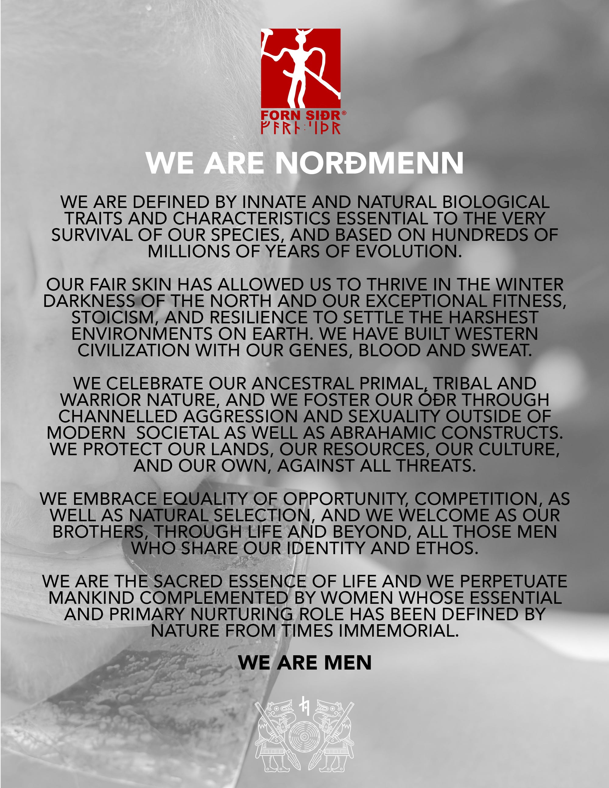 We celebrate our ancestral primal, tribal and warrior nature, and we foster our Óðr through channelled aggression and sexuality outside of modern societal as well as abrahamic constructs. We protect our lands, our resources, our culture, and our own, against all threats.